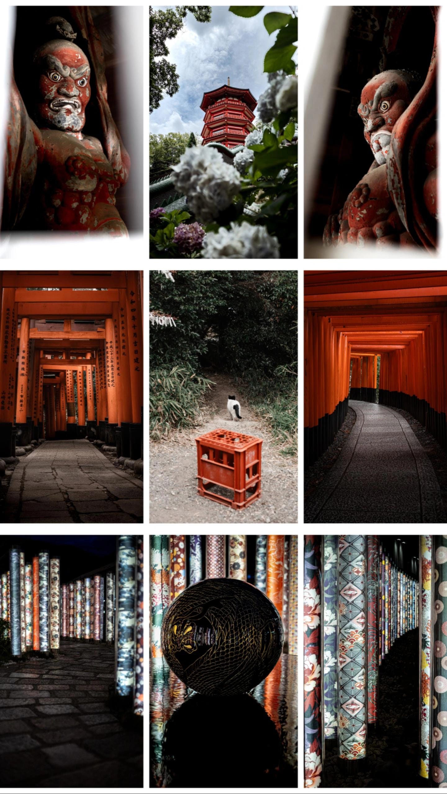 In the beginning I said that that the sense of place through a series of images. Well as I started making these triptychs other patterns began to emerge. Add the three sets of images and I started to notice a habit of putting a center composed subject between two images that are almost mirrors of each other in a way. Also looking at them all together you get a clear sense of Japan through its cultural symbols.