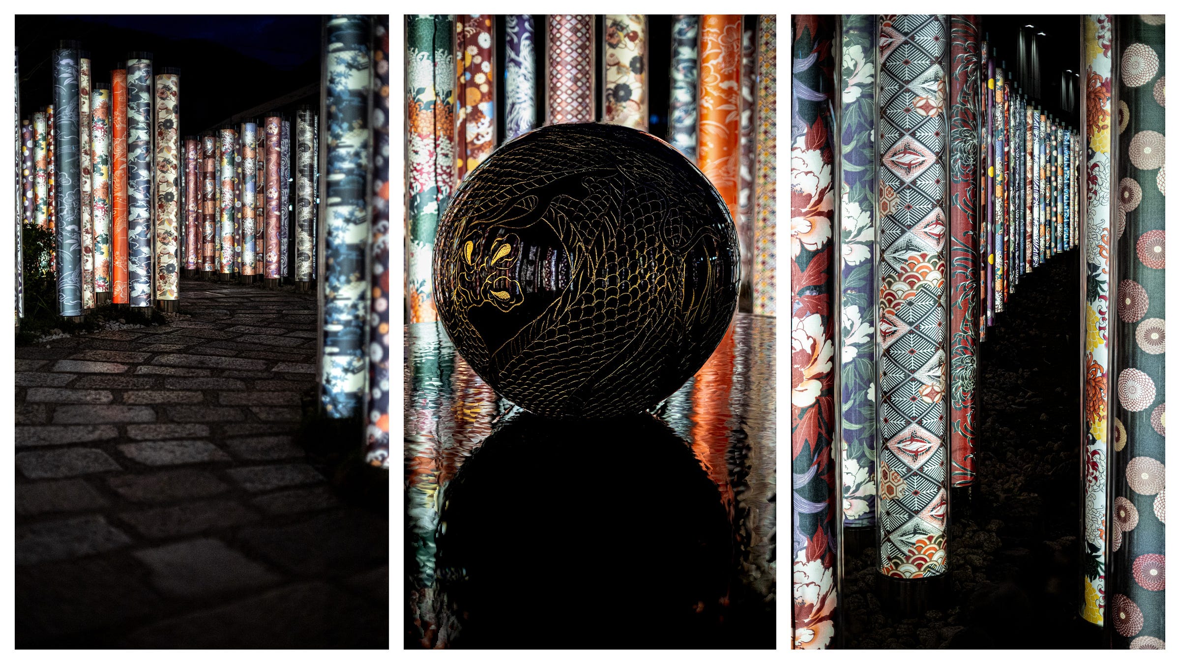 The Kimono Forest is a beautiful display of Japanese textiles and is made even more amazing when scene at night. The beautiful colors and patterns glowing along the paths are a well curated exhibit. The allure of the fountains waters being known to make your wishes come true only add to the magic of this place.