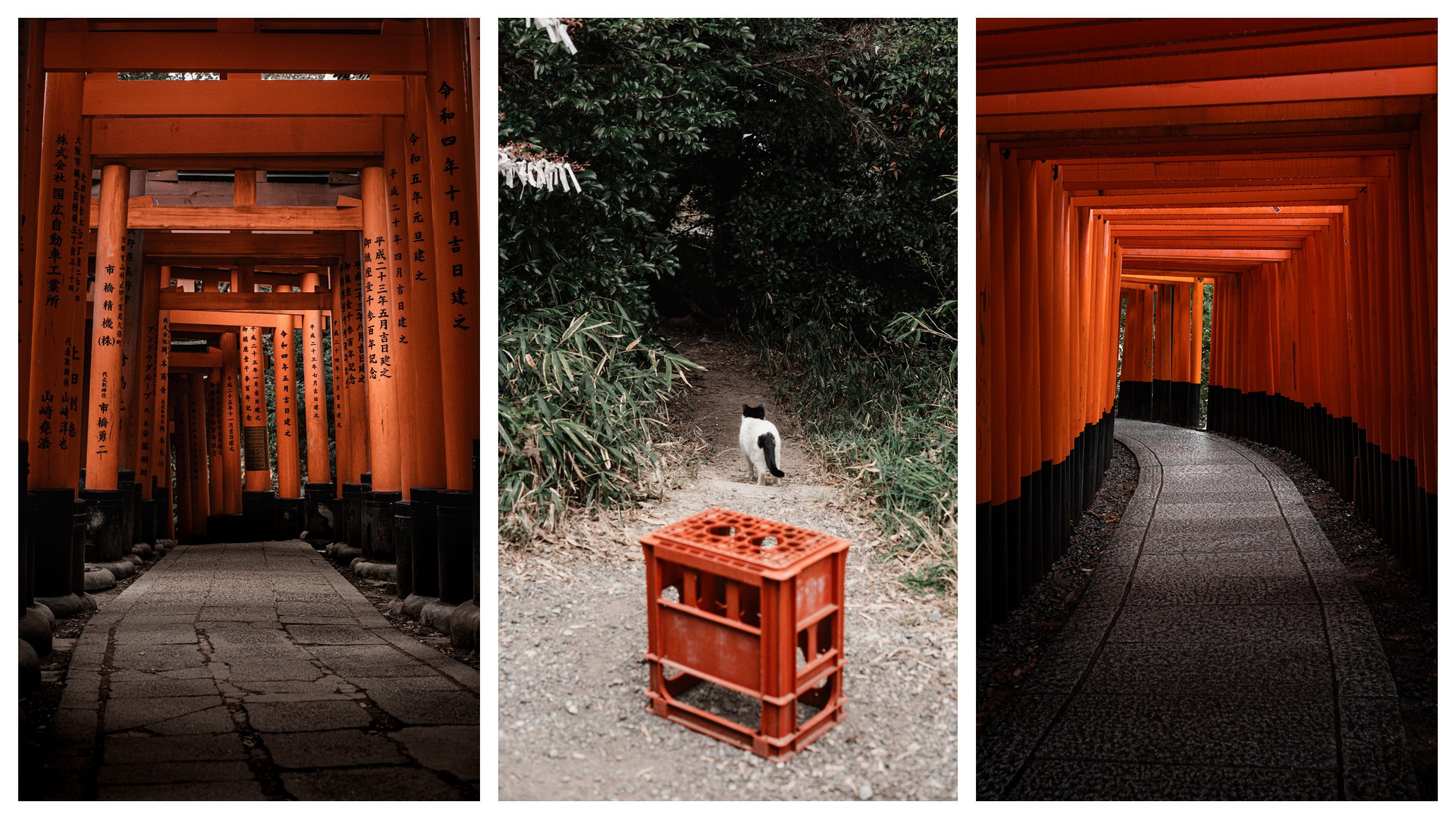 The thousands of Torii gates at Fushimi Inari Shrine is one of those can’t miss things when visiting Kyoto. Everyone goes to see the shrines, tries to carve out a tiny space with no one else in the background to take a selfie, and then push through the waves of people to find a place to sit or eat. Regardless, the Torii Gates themselves let you know exactly where these images are from. The cat and the crate on the other hand is much less obvious. The shrine is filled with fox statues so seeing a cat (it’s fox like right?) along the path with a Torii gate colored crate behind it seemed like a perfect way to tie the other two images together.