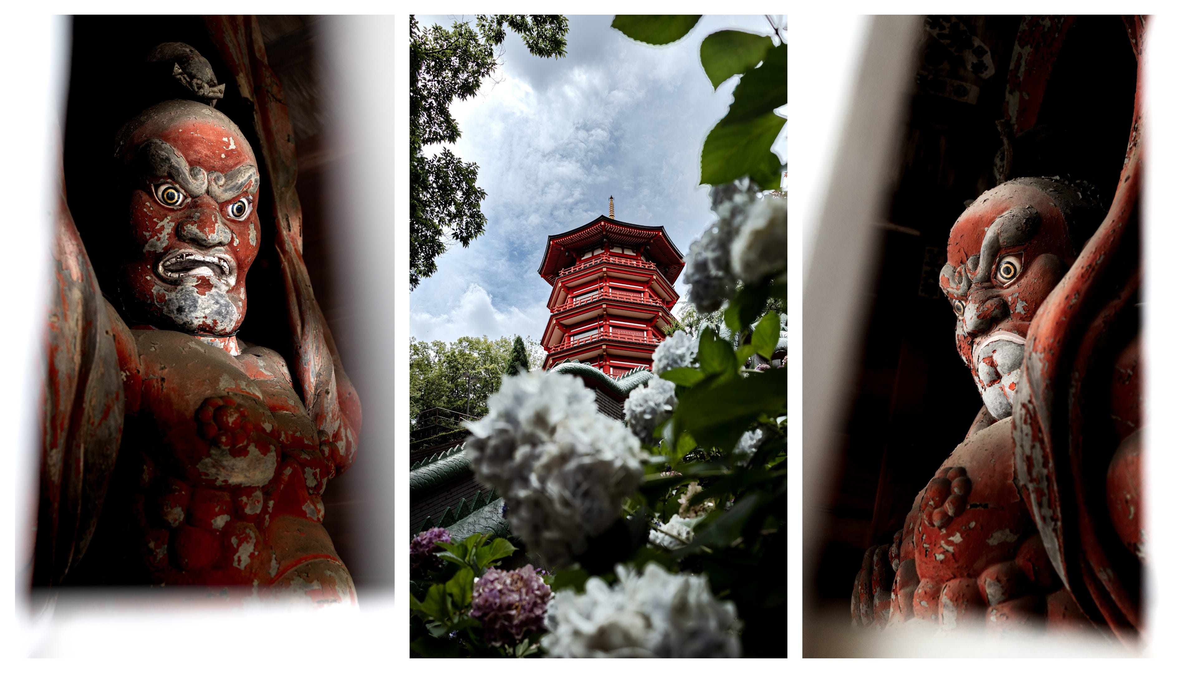 Now, you might be thinking that these don’t really give off an idea of a particular place. I get that. Nio Guardian statues and red pagodas are pretty common Buddhist symbols across Japan but that’s a start. Even if Japan wasn’t your first thought it at least provides enough context to send your mind to a certain region of the world. For me though, these three images symbolize my experience at Yamaguchi Kannon. Walking between these two Nio Guardians trapped behind their white wooden lattice, up the stairs to the main temple. Just around the temple is a path leading to the small pond and several statues to explore. Ultimately leading to the never ending flights of stairs up with a dragons scaled body on either side. These three images hold the memories of summer hydrangeas. hungry mosquitoes. and burning calves after reaching the top of those stairs. They truly define the place for me.